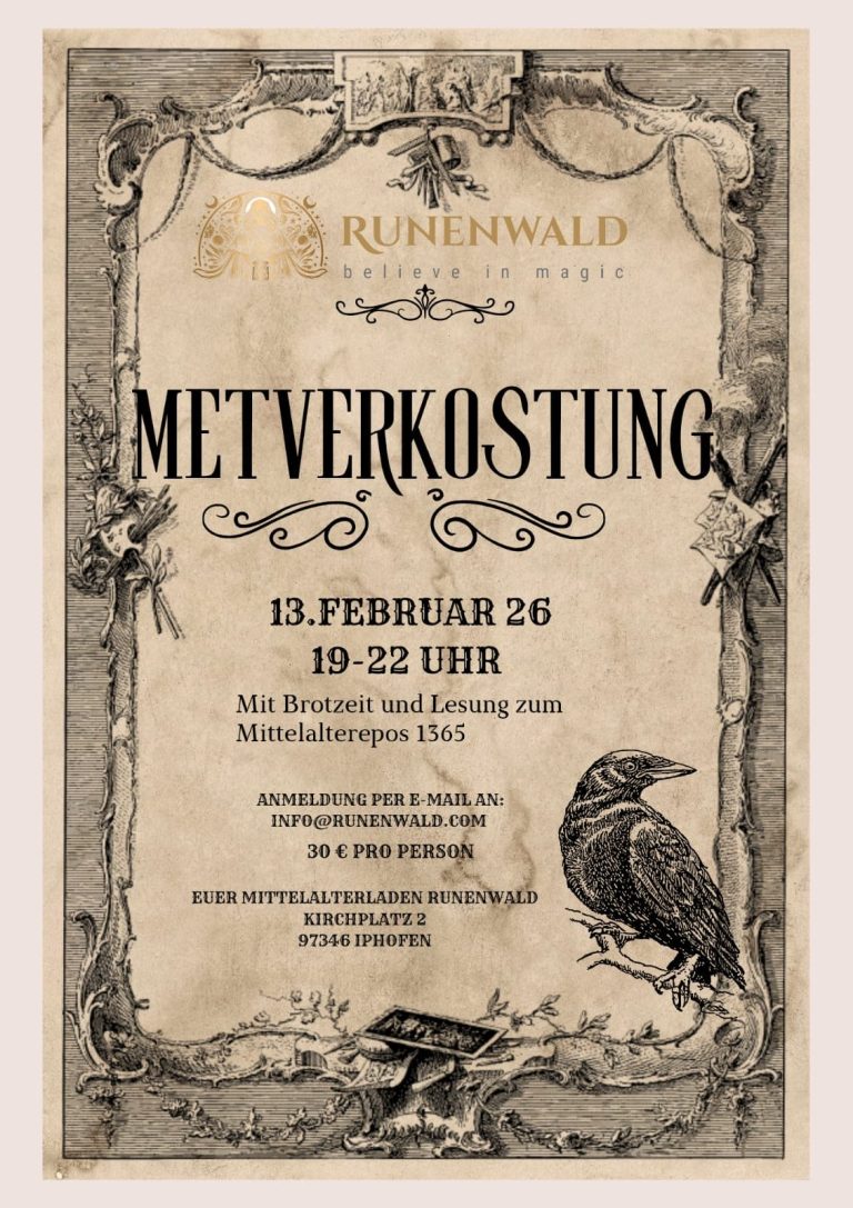 Am 13.02.2026 findet für Metliebhaber und die, die es werden wollen, die zweite Honigweinprobe in 2026 statt. Es werden 8 qualitativ hochwertige Honigweine in 0.1 Liter Tonbechern verköstigt. Um den dabei aufkommenden Appetit zu bremsen, wird es verschiedene Brote, Käse und Trauben auf Meerrettich geben. Zwischendurch wird Gwénola aus ihrem Heldenepos 1365 lesen, da gerade auch der dritte Band erschienen ist.